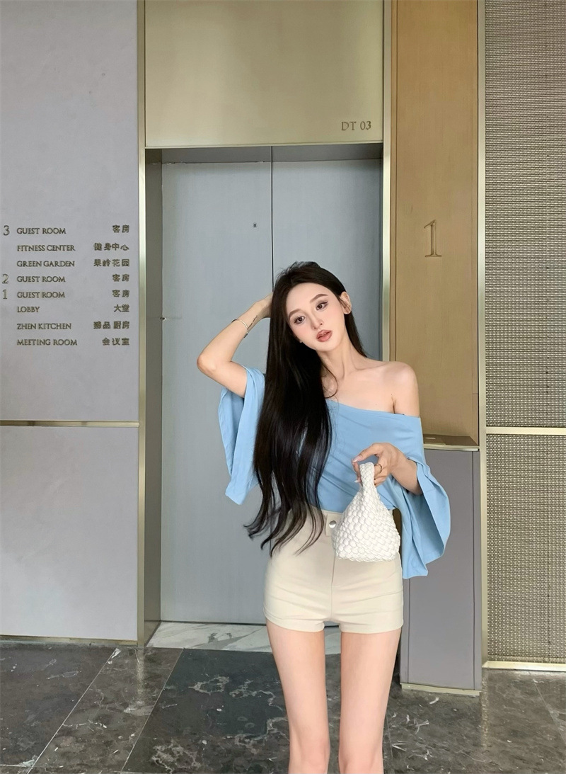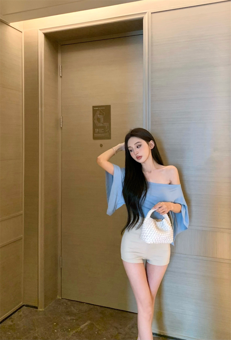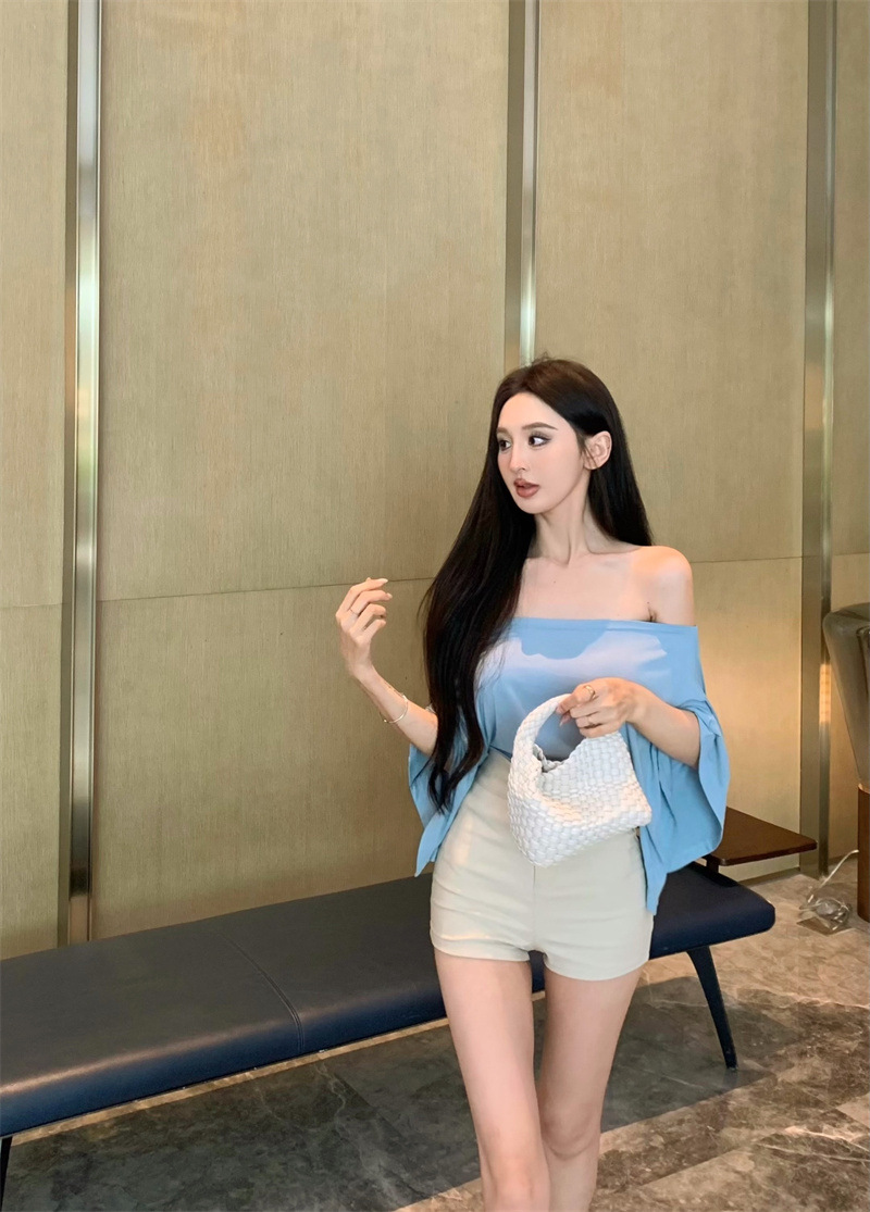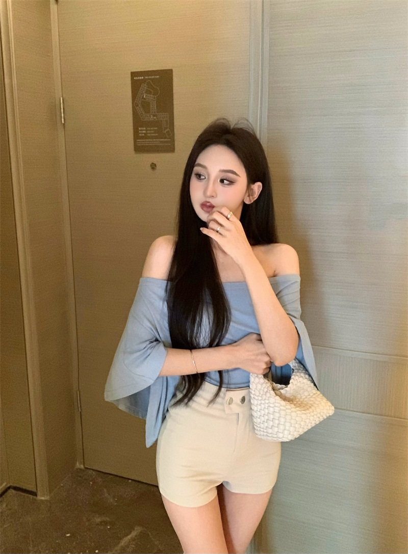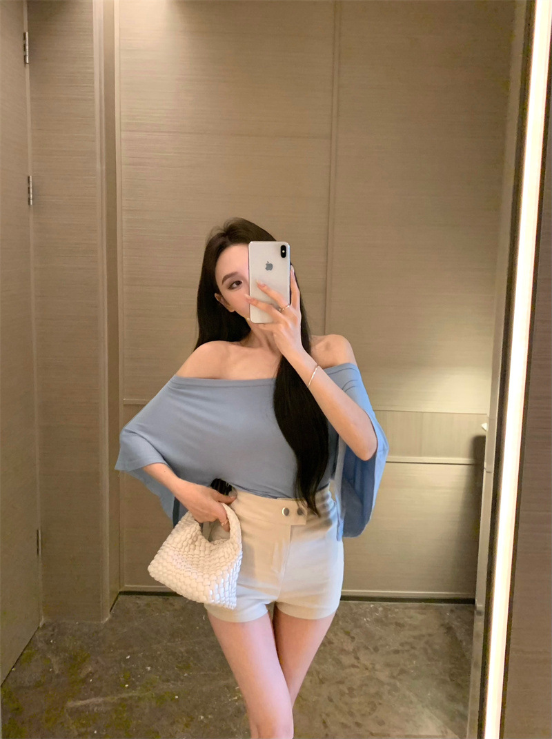 Off-neck Blue T-shirt Women's Summer Tight Waist Slimming And Shoulder Hollow Top