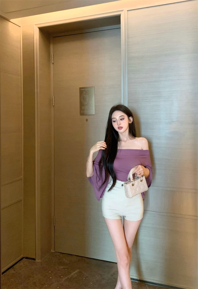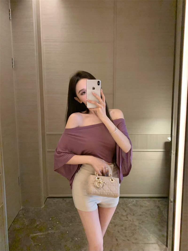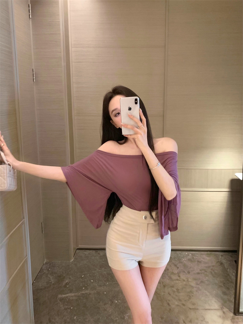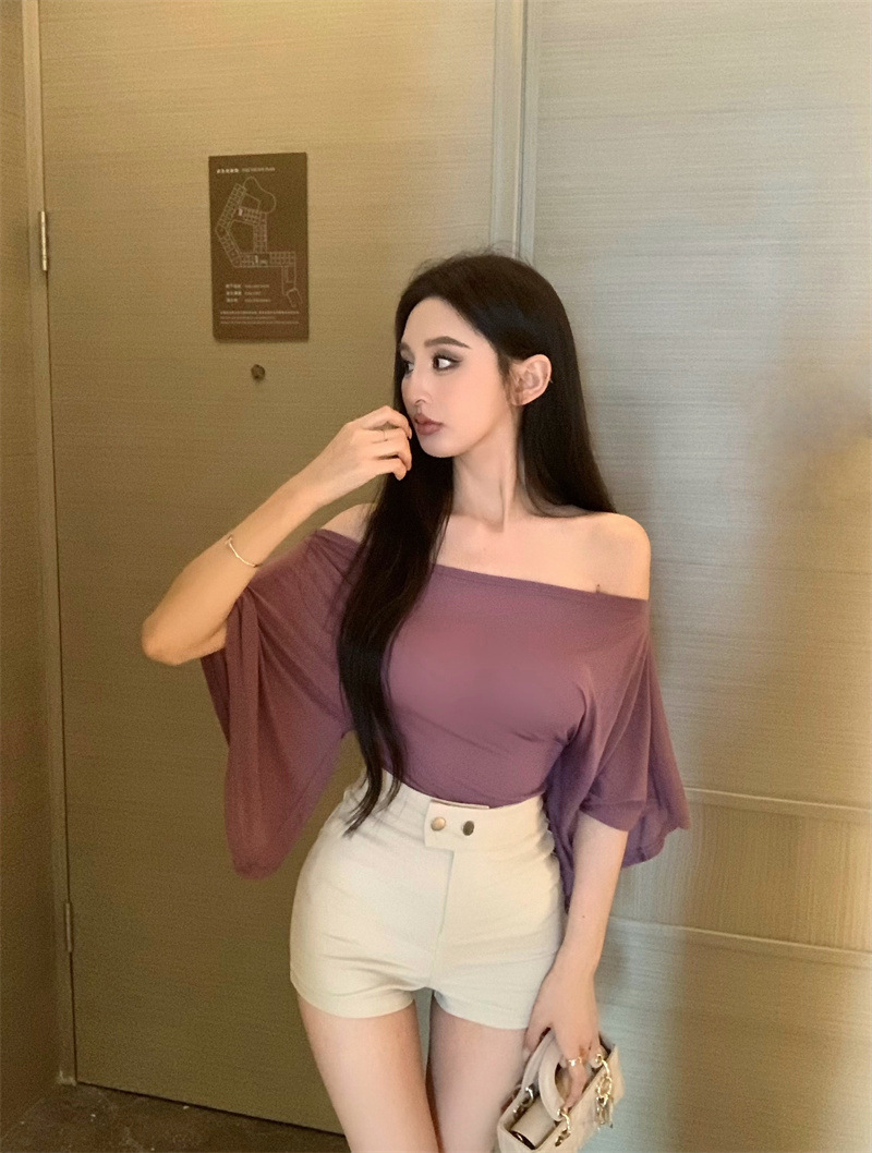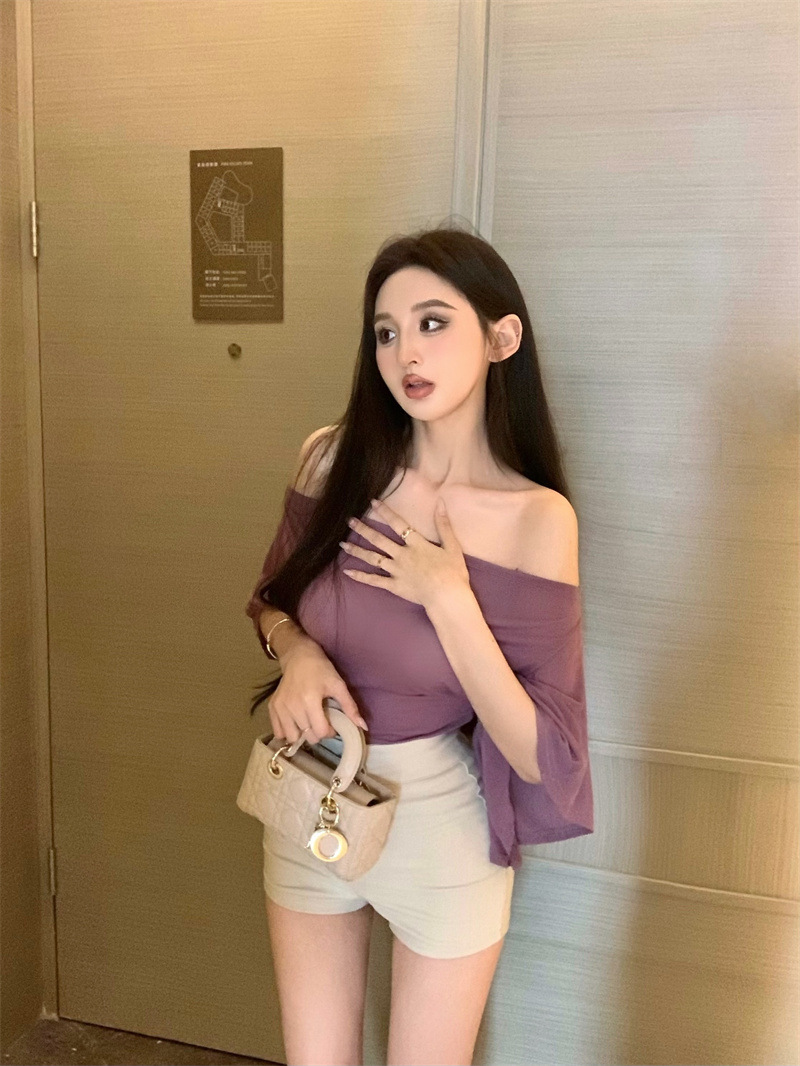 Off-neck Blue T-shirt Women's Summer Tight Waist Slimming And Shoulder Hollow Top