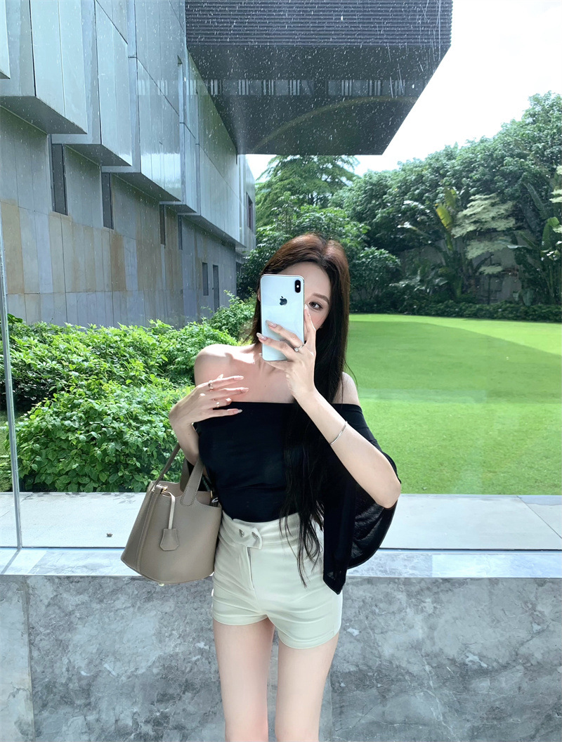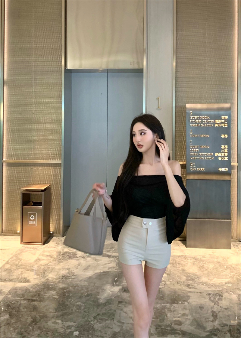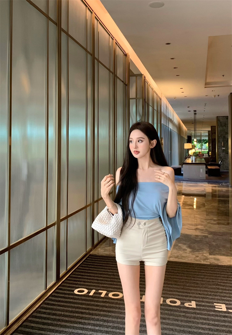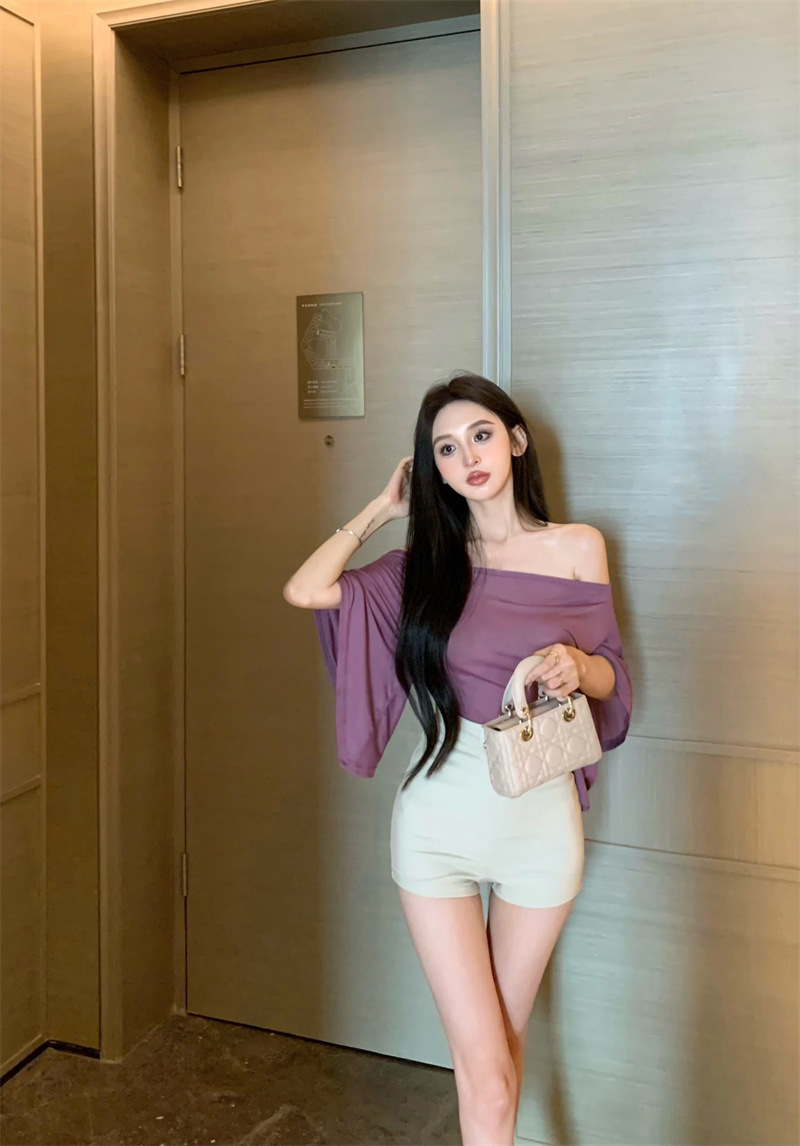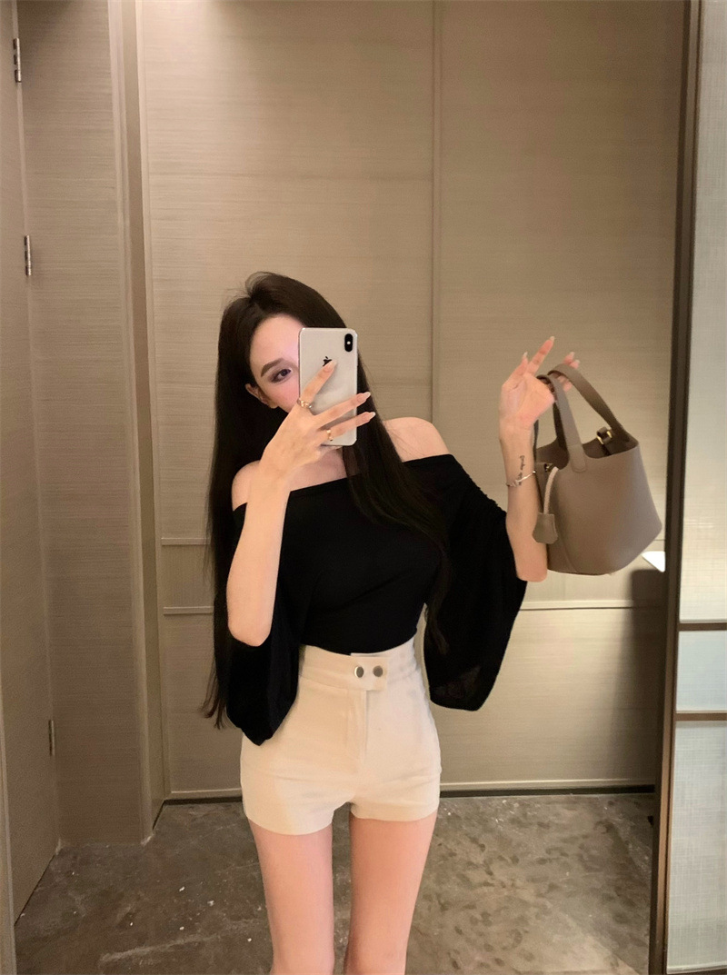 Off-neck Blue T-shirt Women's Summer Tight Waist Slimming And Shoulder Hollow Top